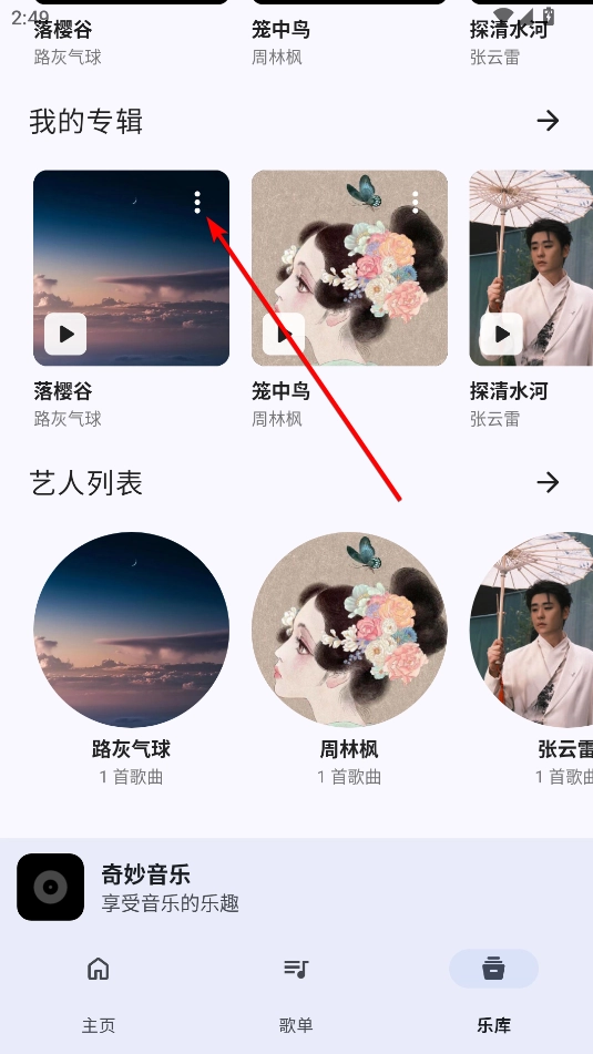 1、打开奇妙音乐,点击歌曲旁边的三点按钮