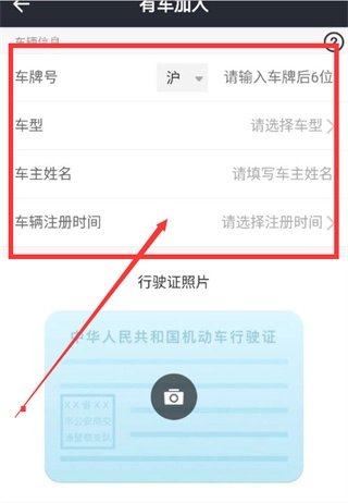 6、填写你的车牌号,车型,车主姓名和车辆注册时间并上传行驶证照片。