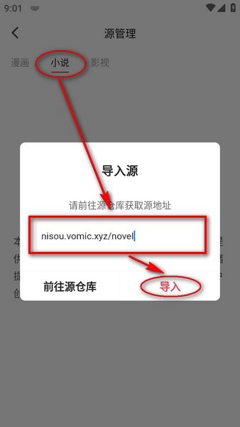 3、以“小说”为例,点击中间的“+导入源”按钮,接着把上方的小说源地址复制粘贴进去,再点击“导入”即可。