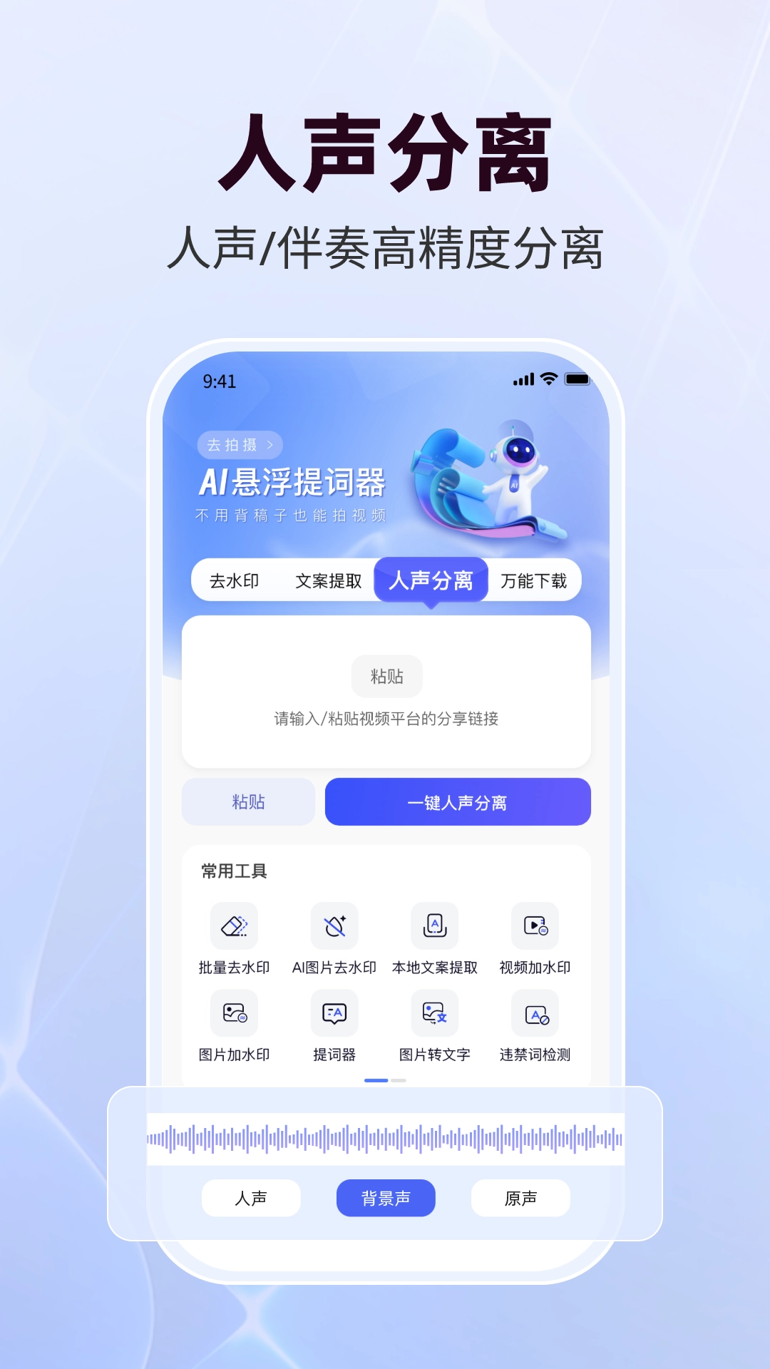 直播蜂App是一款专门为直播创作者打造的辅助工具,它集成了短视频文案提取、违禁词智能检测、悬浮式提词器、人声背景音分离、音频优化处理以及本地视频剪辑等实用功能。平台提供的丰富视频处理工具支持在线随时调用,兼容多种格式的视频文件操作,能为用户提供个性化的短视频创作支持,快来体验吧!