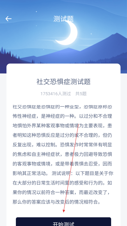 2、在测试题页面点击【社交恐惧症测试题】选项进入测试详情页面。