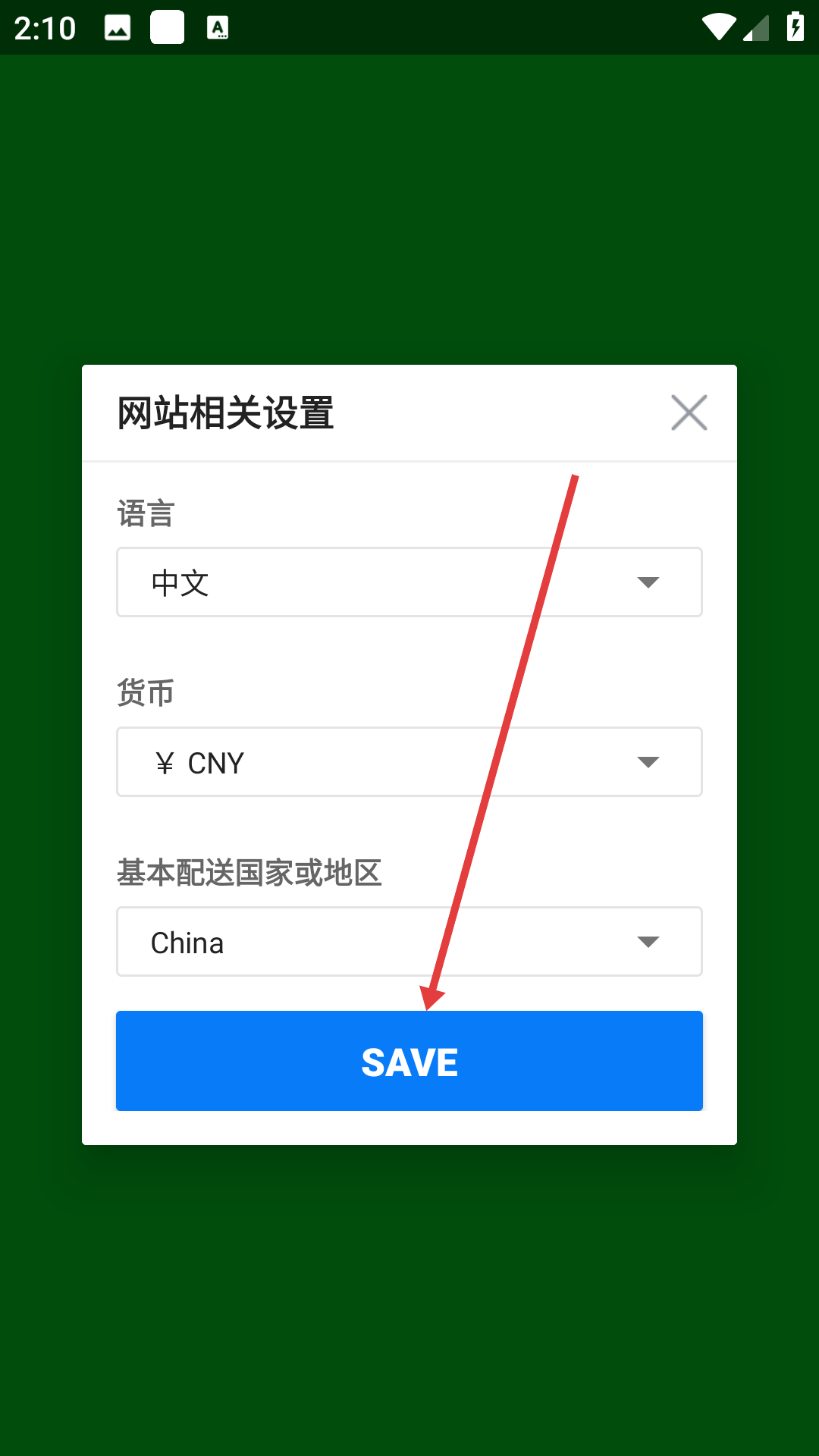 1、在网站相关设置页面完成语言、货币、配送地区设置后,点击【SAVE】保存设置。