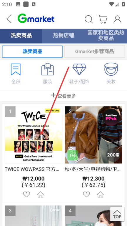 2、在Gmarket首页点击【热卖商品】,进入热卖商品分类页面。