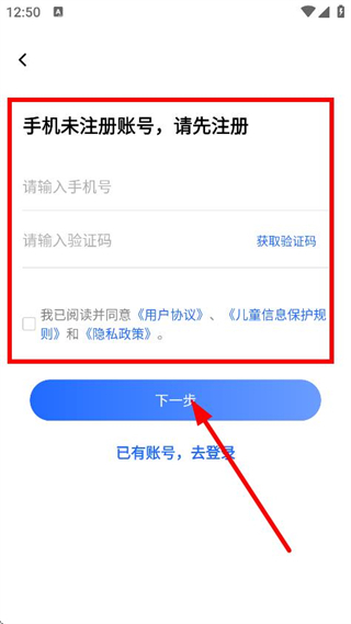 4、按照提示输入手机号,获取并输入验证码,点击下一步进行注册。