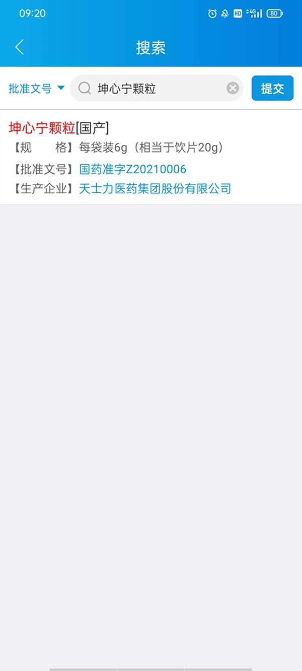 4、提交后,系统会弹出该药品的批准文号,同时还会展示一些基本信息。