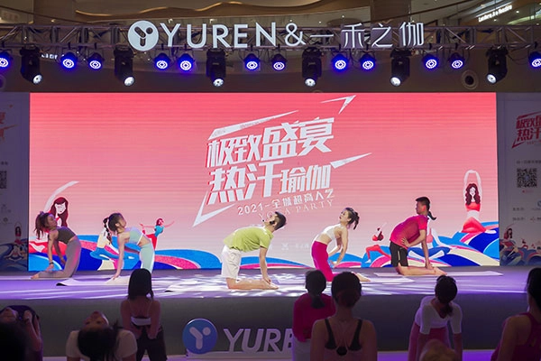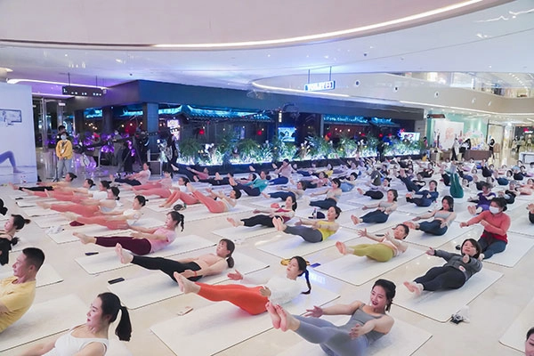 YUREN瑜伽与一禾瑜伽在双子塔下的绿地缤纷城商场一楼大厅,共同开启了一场充满欢乐与活力的热汗体验。