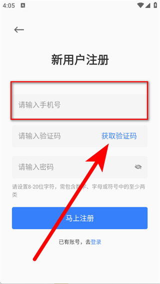 4、输入验证码,设置8-20位且包含数字密码,点击马上注册,完成账号注册。