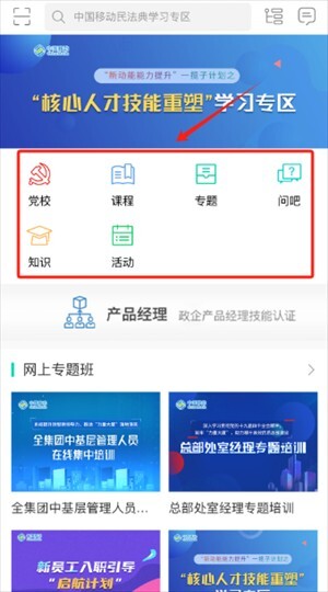 2、打开进入,在首页中提供了党校、课程、专题等多种该功能