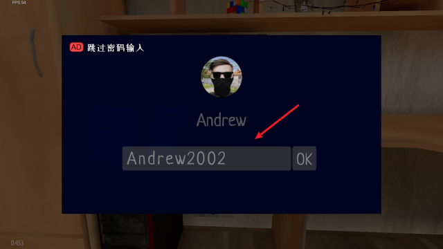 房间里电脑的密码是Andrew2002,走到电脑旁边后,点击下方的机箱就能开机,接着在输入框里输入密码就能打开电脑了。
