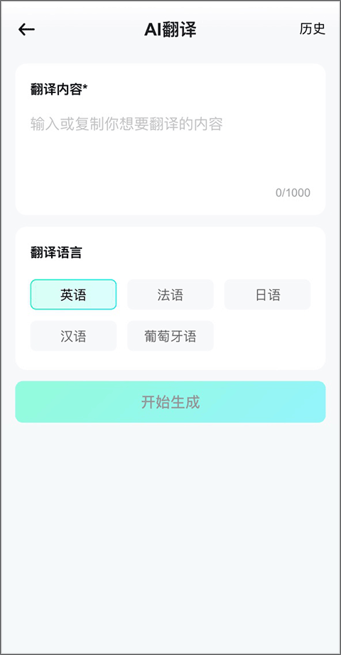 2、输入想要翻译的内容,选择语言,点击“开始生成”。