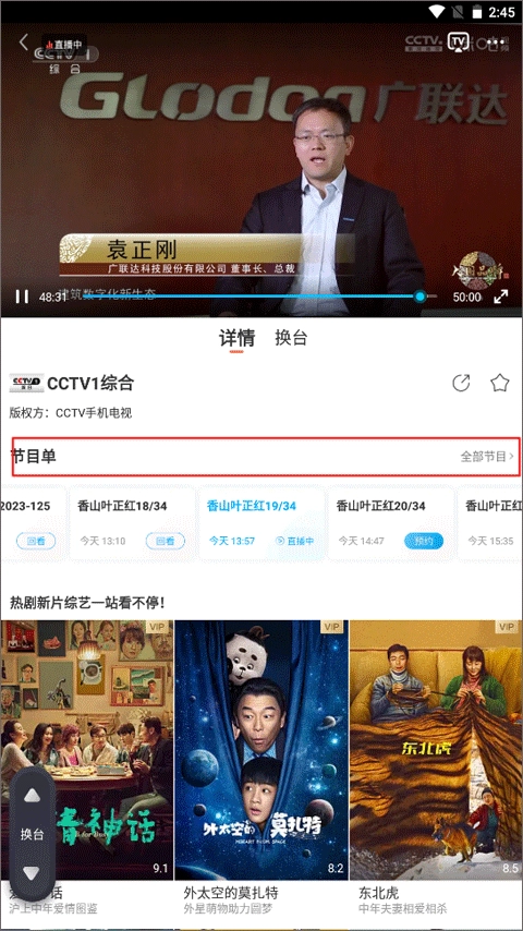 4、系统会自动切换至横版模式并进入播放界面,你可以在此进行投屏、换台、查看节目单等操作。