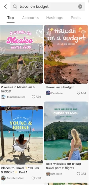 用户们也可以直接搜索自己感兴趣的话题,例如旅游话题