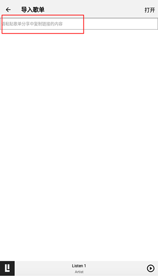 3、找到需要导入的歌单链接并复制下来,这类链接通常能在歌单的分享选项中获取,接着把链接粘贴到指定的输入框内,点击“打开”按钮,就能完成歌单的导入操作啦