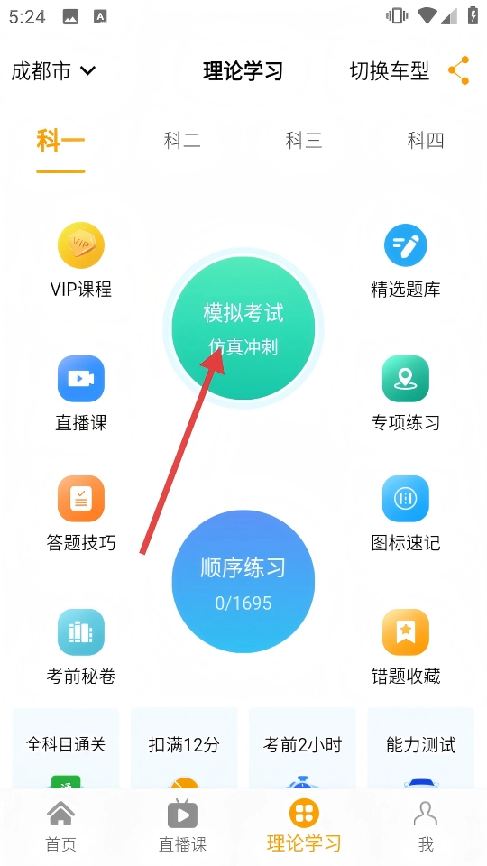 2、在理论学习页面,选择【科一】板块下方的【模拟考试仿真冲刺】。