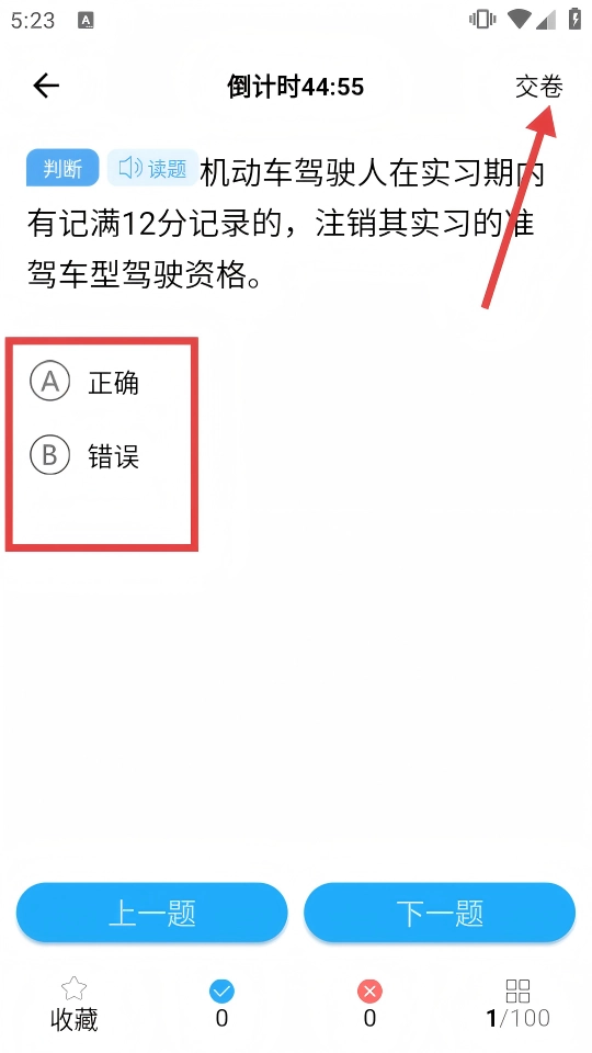 4、最后进入答题界面,根据题目选择正确的答案,全部作答完毕后点击页面右上角的【交卷】。