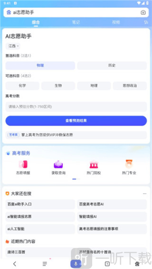 1. 在本站完成软件的安装与打开操作后,在搜索框内输入“AI志愿助手”,就能进入百度AI志愿助手界面,在该界面中,你可以开展志愿报考相关的分析工作。