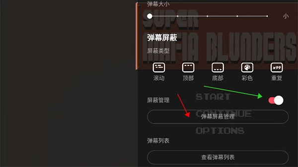 2、在右侧弹出的弹幕设置界面里,打开弹幕屏幕管理(即下图绿色箭头指向的选项),接着点击【弹幕屏蔽管理】(也就是下图红色箭头指向的选项)。