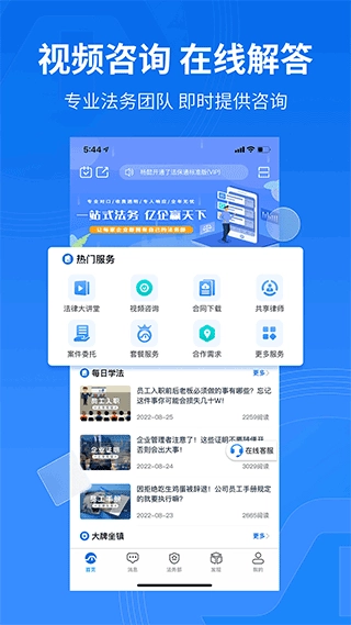 【法律咨询服务】 提供实时在线法律咨询支持,专业法务人员承诺1分钟内响应用户需求;同时配备律师视频咨询服务,采用团队协作模式为用户提供一对一专属服务。