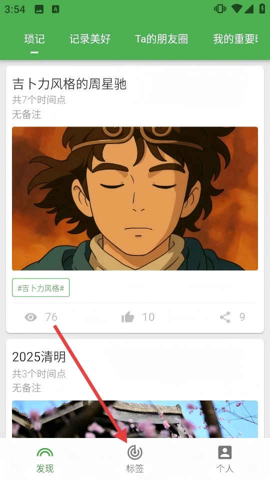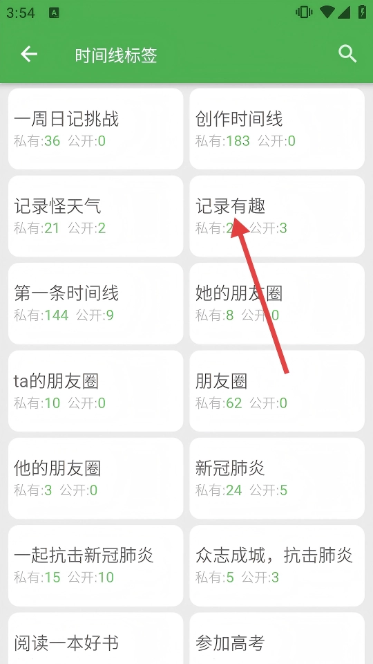 3、在时间线标签列表页,点击【记录有趣】标签,进入标签详情页。