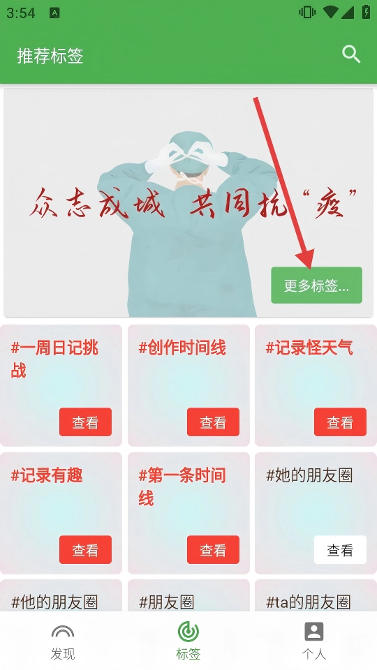 2、在推荐标签页面,点击【更多标签】,进入时间线标签列表页。