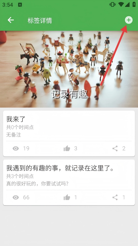4、进入标签详情页后,点击右上角的绿色【+】按钮,即可跳转至内容发布页面,进而完成“记录有趣”标签下的内容发布操作。