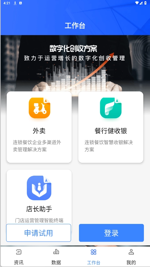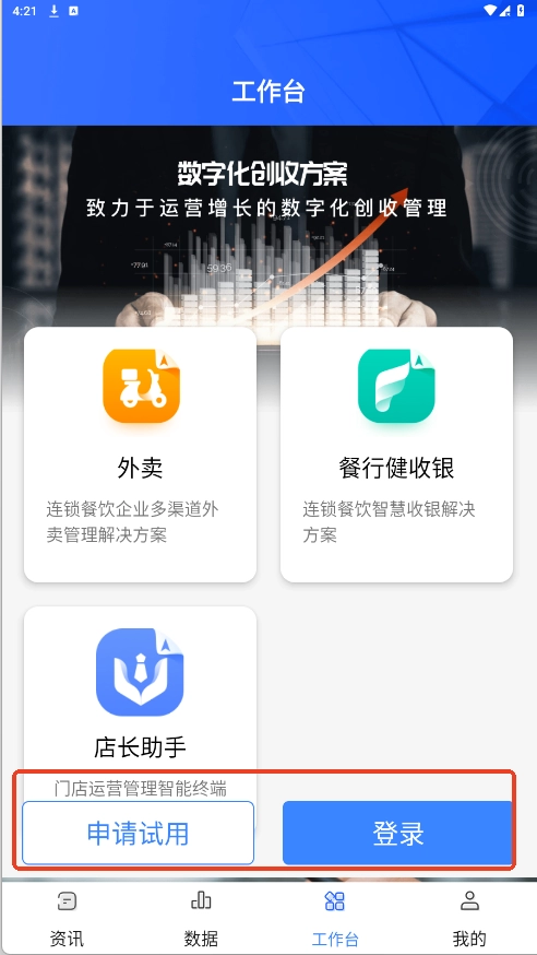 3、在数据和工作台界面,可以点击申请试用或者登录