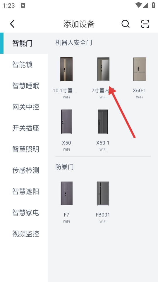 1、打开,点击【添加设备】,进入含智能门、机器人安全门分类的设备选择页面。