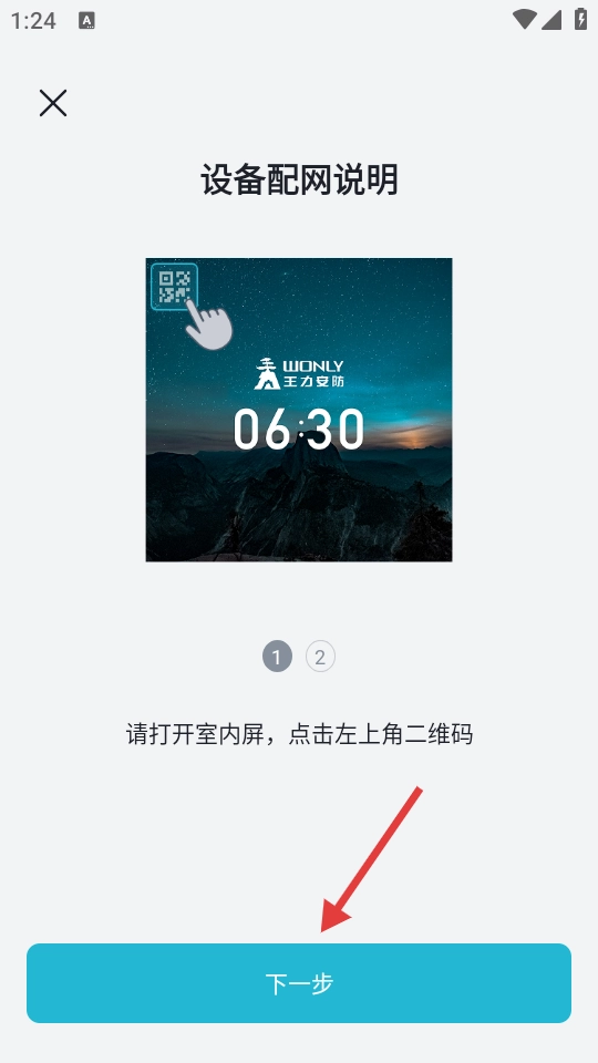 3、按配网说明操作,点击蓝色【下一步】,进入扫一扫页面。