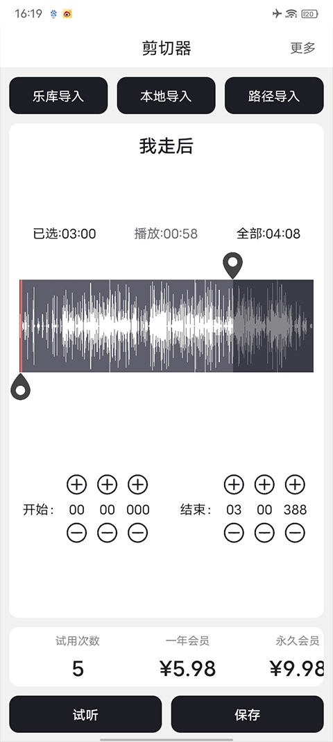 2、导入要截取的音频,完成截取操作后点击保存。需注意该软件提供5次免费导出音频的机会,后续可开通9.98元的永久会员,性价比很高。