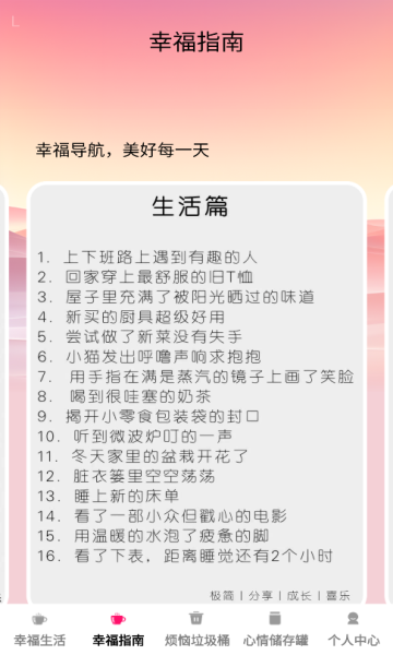 【幸福指南】为您送上实用的生活建议与技巧,帮您在日常点滴里发掘更多幸福的源泉;