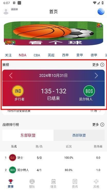 1、启动软件后进入赛事界面,该界面涵盖NBA、CBA、英超、西甲、意甲等各类赛事,以下以NBA凯尔特人队的情况为例进行说明。