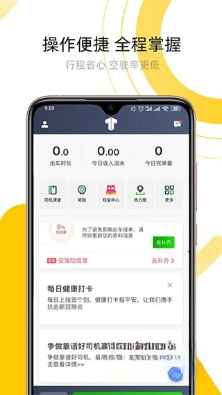 本平台已覆盖全国大量一二线城市,可提供新能源车、出租车、专车等各类出行服务,助力司机轻松接单。平台每日都会实时推送海量订单,司机能自由挑选,便捷上路。此外,系统还具备智能导航、订单统计以及司机讲堂等实用功能,帮助司机更高效地开展服务。