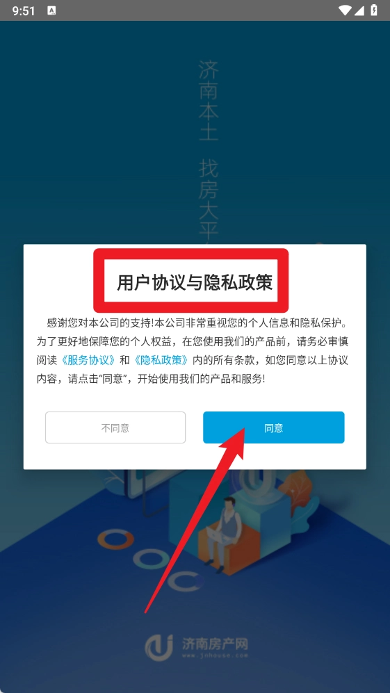 1、首次进入济南房产 网应用,会弹出用户协议与隐私政策提示,请认真阅读内容,确认后点击下方蓝色同意按钮,才可继续使用功能。