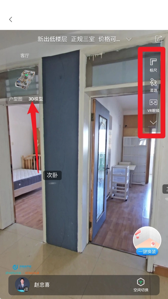 4、在VR功能中,可切换户型图、3D模型、右方标尺、漫游、VR眼镜等快捷操作按钮,下方也可查看经纪人资讯。