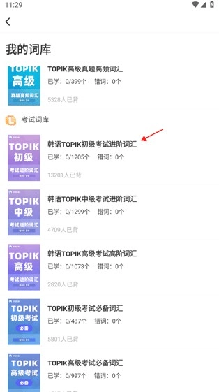 2、进入页面后,会看到多个不同分类的词库,包括延世教材、常用词库等,若要备考韩语,选择考试词库即可。
