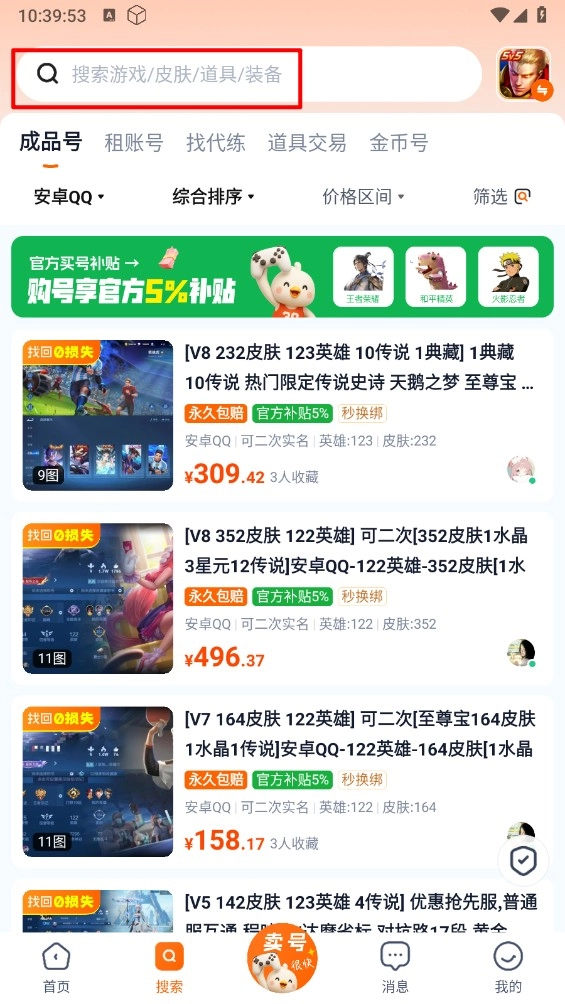 3、还可以在搜索板块进行搜索游戏/皮肤/道具/装备。