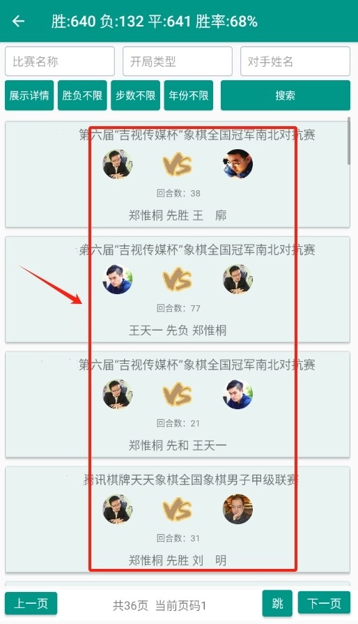 3、进入场次页面后,相关的下棋思路研究内容便呈现在眼前,这样就能尽情钻研高手们的下棋思路了。