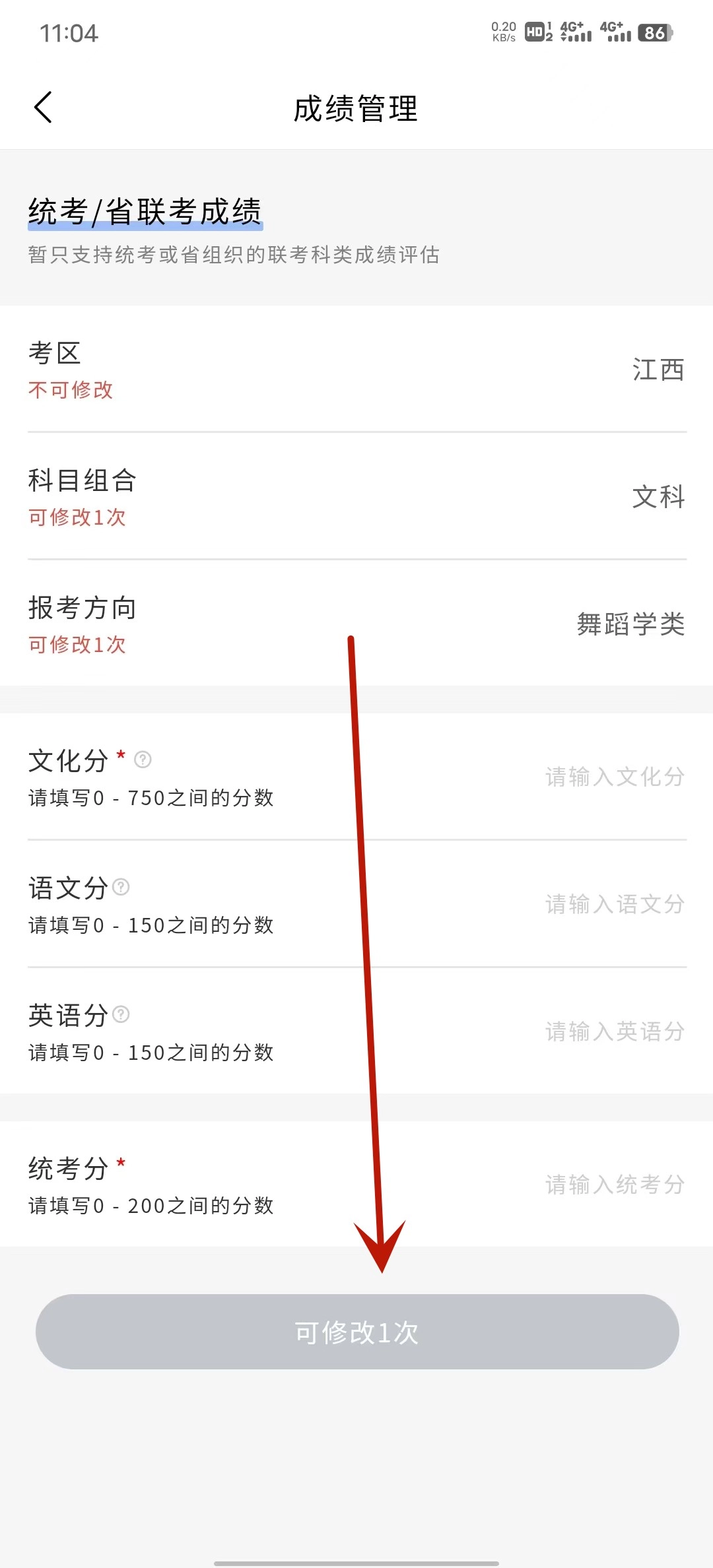 4、填写对应的文化分、语文分、英文分与统考分,点击“可修改一次”按钮提交信息,即可完成信息填写。