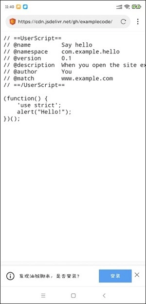 最直接的方法是,你只需在浏览器里打开该脚本的url链接,浏览器识别出这是油猴脚本后,就会自动弹出安装提示,具体可参考下方图片。