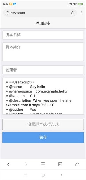 你可以这样操作:先进入浏览器设置,找到浏览器脚本选项,点击右上角的“添加脚本”按钮,选择“新建脚本”。接着,将代码粘贴到“javascript代码”的编辑区域,最后点击保存就完成了。要是油猴脚本符合规范,“脚本名称”“脚本简介”这些字段不用手动填写,浏览器会自动从脚本的元数据里提取相关信息并保存。