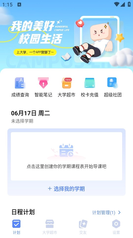 2、在首页里,你能够使用成绩查询、智能笔记、大学超市等功能。