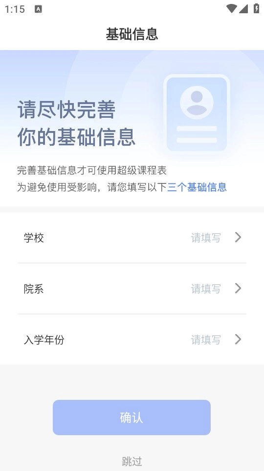 1、在本站获取超级课程表正版应用,打开软件完成注册流程,随后输入个人所在大学的相关信息以及所学专业。