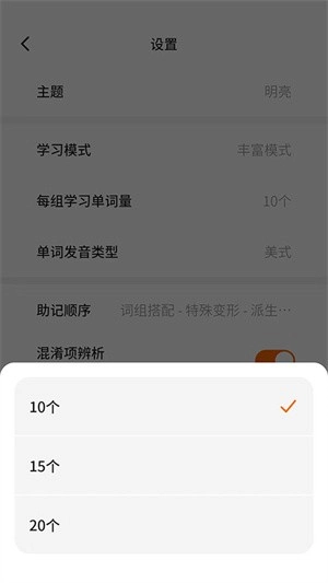 3、进入设置界面,选择“每组学习单词量”选项;