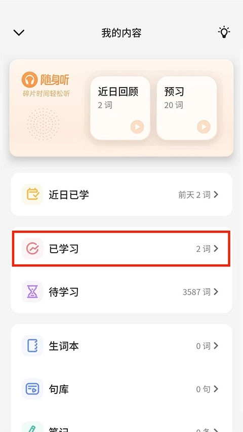 2、进入我的内容界面,选择“已学习”选项,