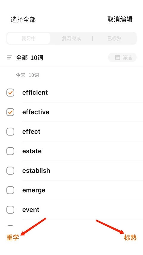 4、将下方单词进行勾选,选择“重学”或者“标熟”,