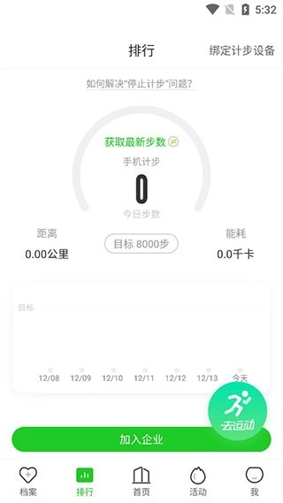 1、在导航栏里找到“排行”选项,接着点击界面右上角的“绑定记步设备”按钮。