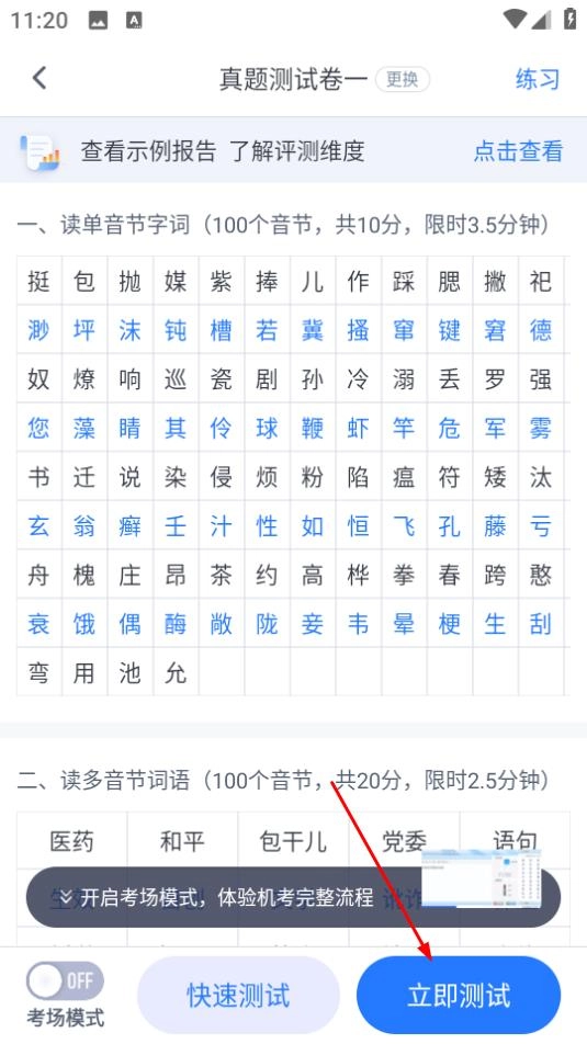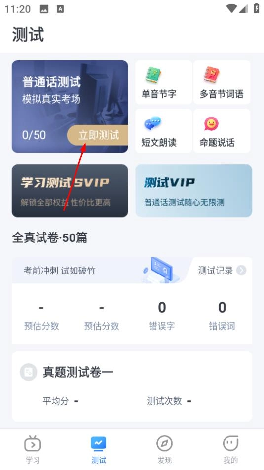 2、在测试页面,点击普通话测试的立即测试,进入真题测试卷页面。
