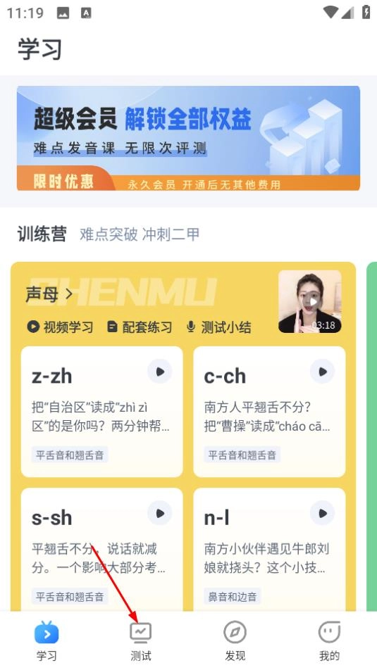 1、打开普通话练习,点击页面底部的测试,进入测试页面。