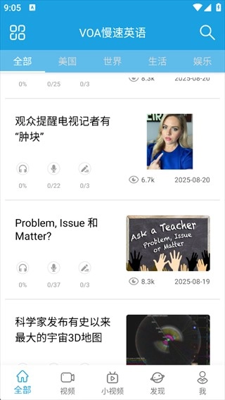 1、打开正版VOA慢速英语,在“全部”界面里挑选你想听的内容,然后点击红色方框中的选项;