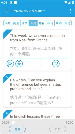 记录你的声音、分享到评论区、大声秀出口语,还能进行口语测评,显示句子得分和单词按键